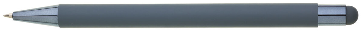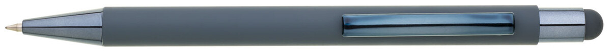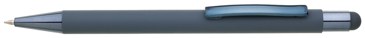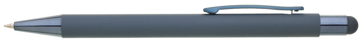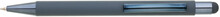 Světle modré pogumované matné tělo propisky doplňují lesklé doplňky v barvě těla a matný touch konec. Logo po vylaserování je lesklé stříbrné. Velkoobsahová modře píšící náplň.