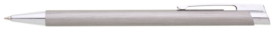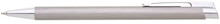 Šedá kovová propiska s jemně rýhovaným povrchem.