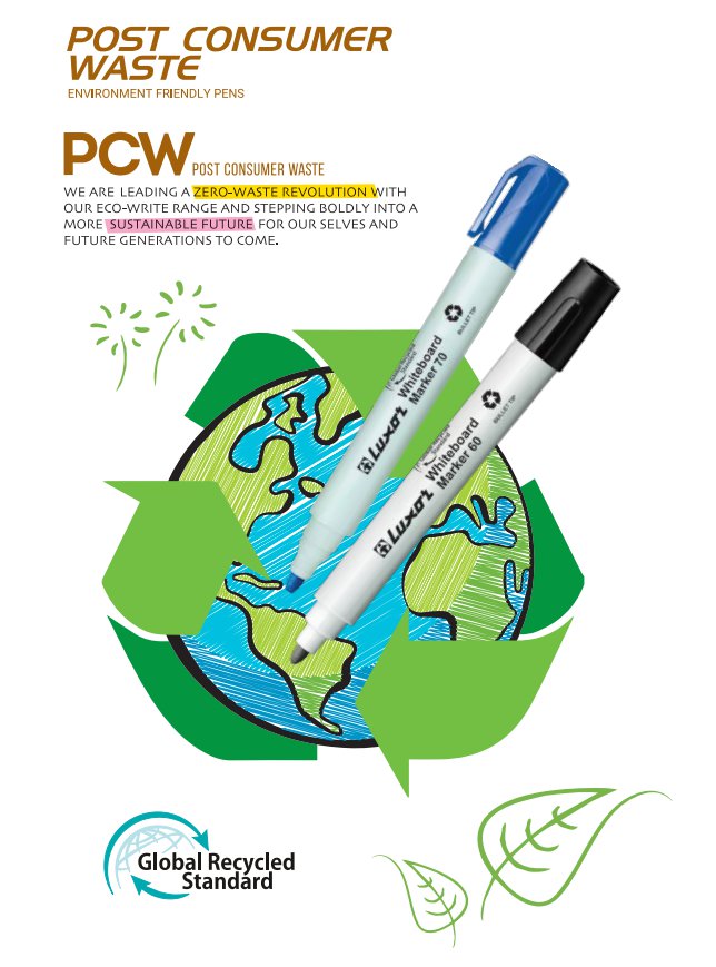 I když náplň a cena i kvalita psaní zůstávají stejné, jejich obaly se vyrábí z PCW (Post Consumer Waste).
