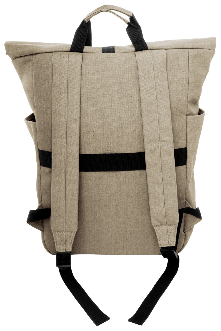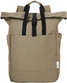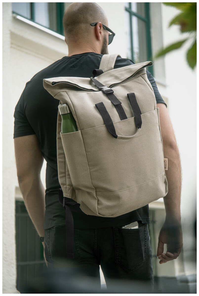 Rolovací batoh z recyklovaného plátna se zapínáním na přezku a suchý zip, polstrovaná přihrádka na notebook (15"), přední a boční kapsy. S popruhem na vozík, polstrovaná záda a ramenní popruhy. 70% recyklované bavlny a 30% RPET polyesteru. S výrazným štítkem z recyklované bavlny.