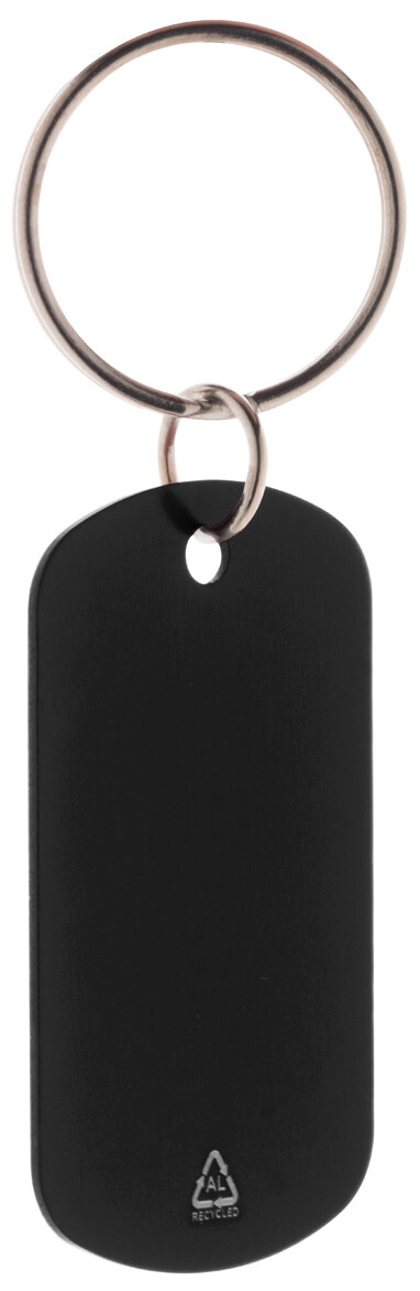 Přívěšek na klíče z recyklovaného hliníku s kovovým kroužkem.