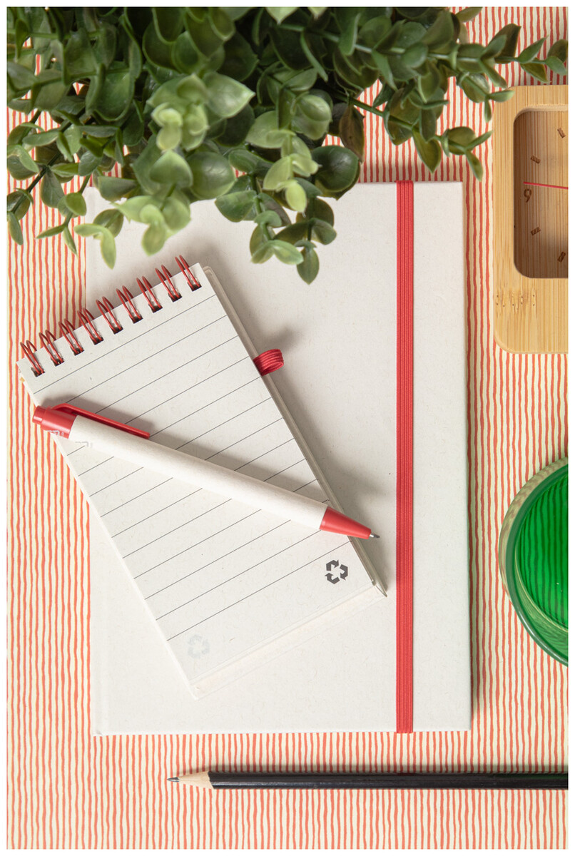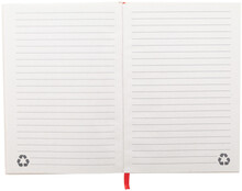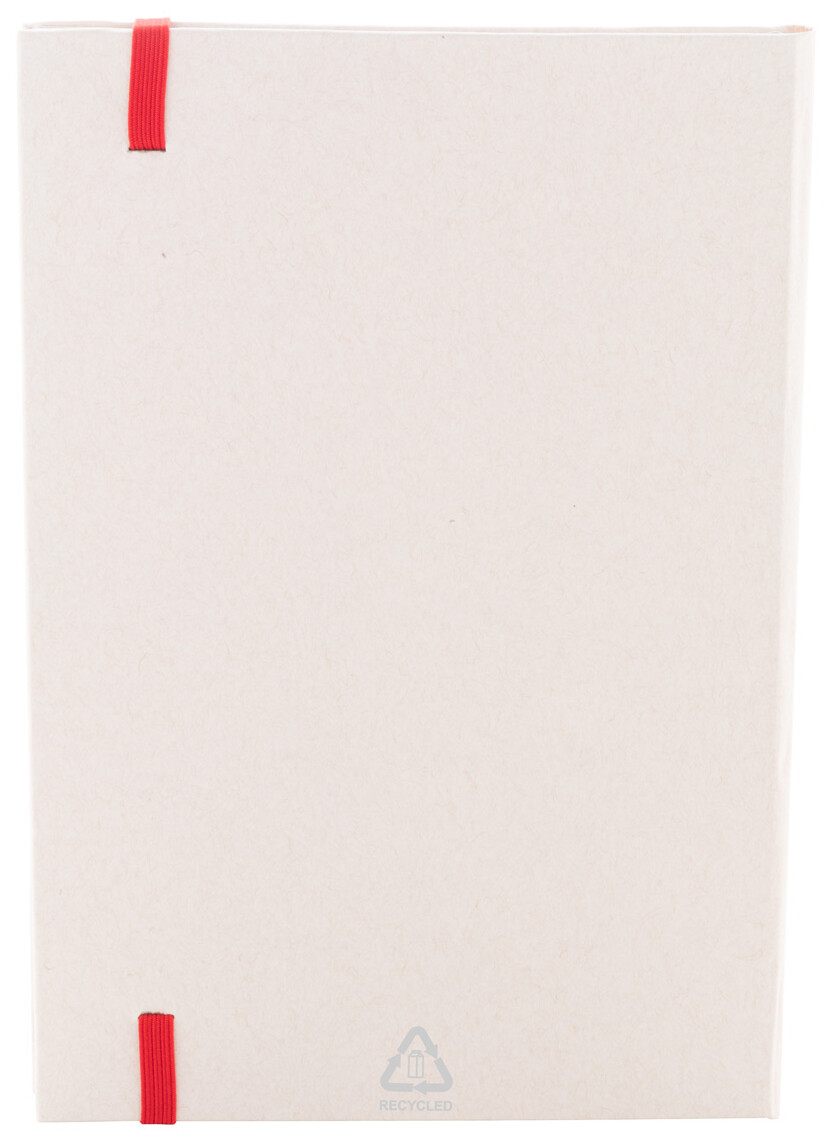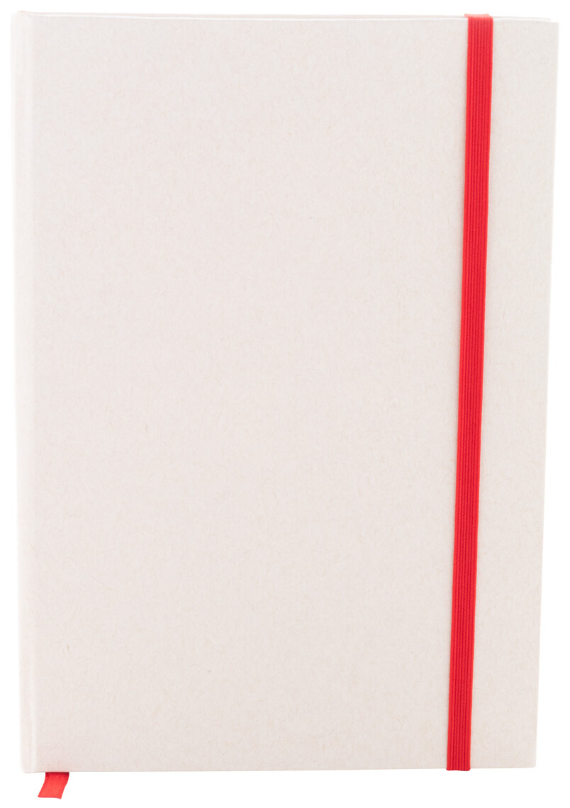 Blok A5 z kartonu z recyklovaného mléka s pevnou vazbou, 80 linkovanými listy a elastickým páskem v odpovídající barvě.