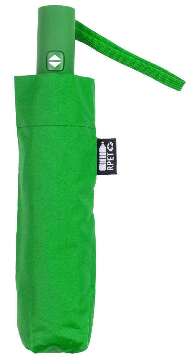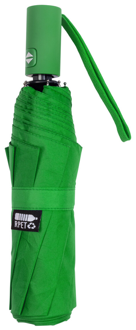 Plně automatický (otevřít/zavřít), větruodolný skládací deštník s 8 panely v pouzdře ve stejné barvě. S kovovým rámem, sklolaminátovými žebry a pogumovanou rukojetí. Pongee 190T RPET. S výrazným štítkem RPET.