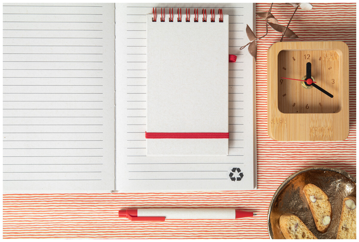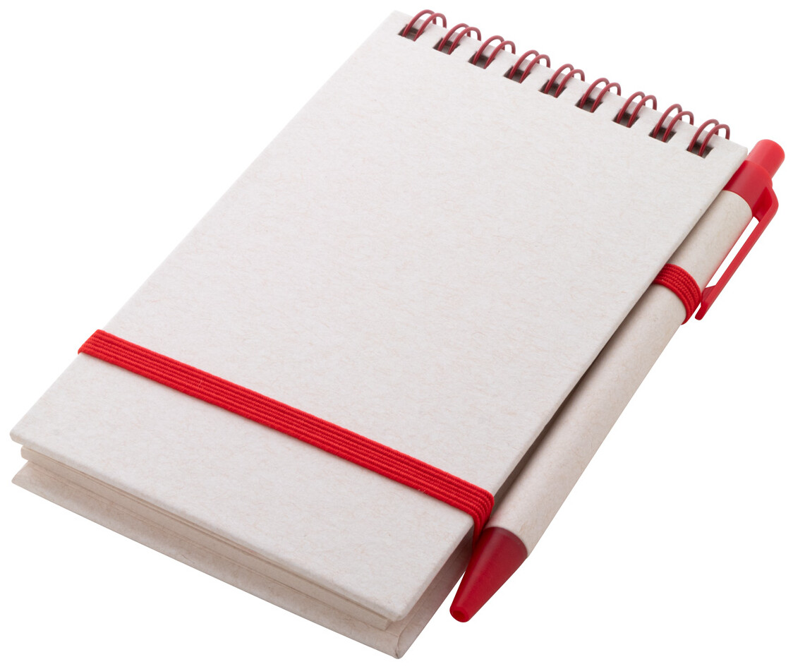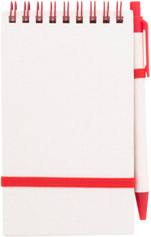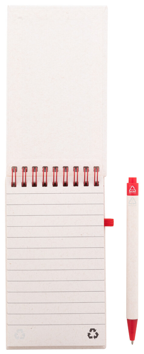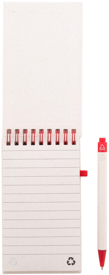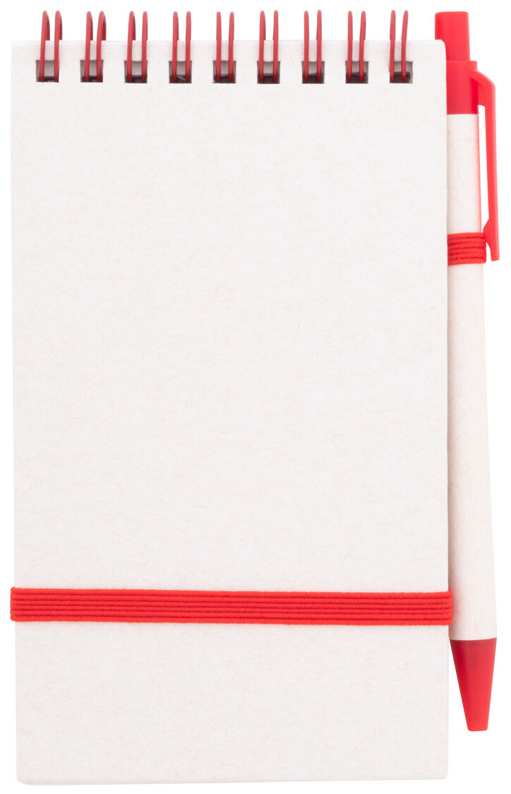 Spirálový blok A6 s deskami z recyklovaného z kartonu na mléko s pevnou vazbou a 70 linkovanými listy. Se spirálovými kroužky ve stejné barvě, gumičkou a poutkem na pero. Včetně recyklovaného kartonového papíru na mléko a recyklovaného ABS plastového kuličkového pera s modrou náplní.