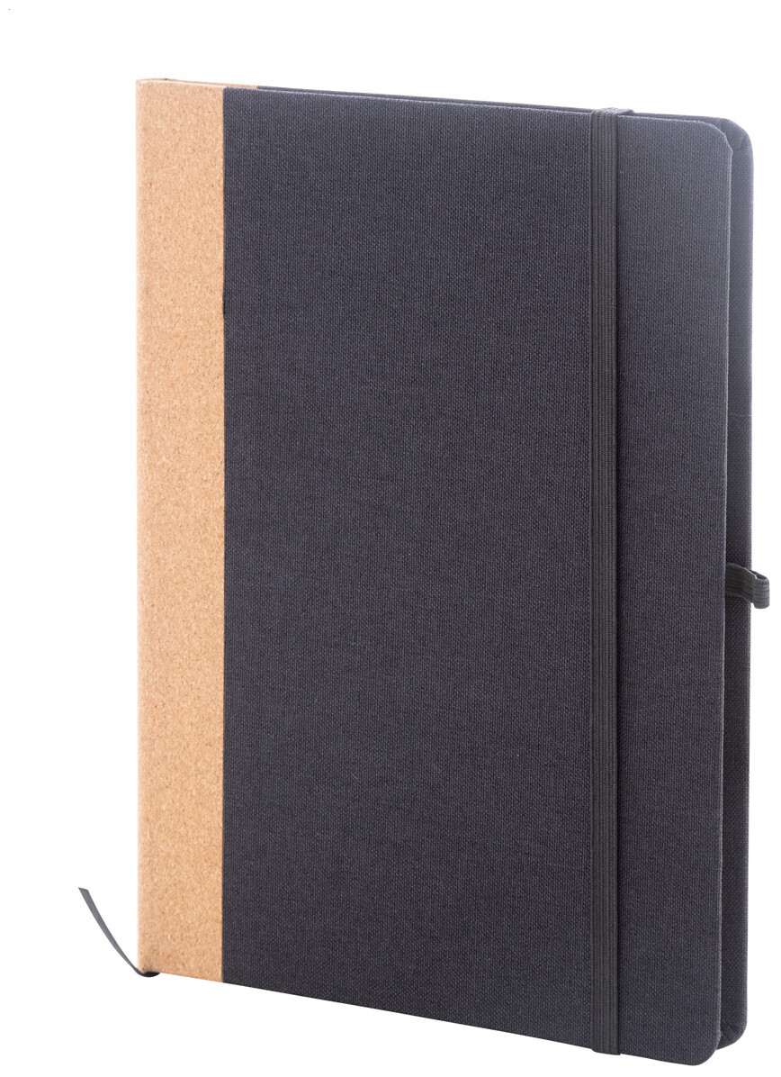 Blok A5 potažený polyesterem RPET s hřbetem z přírodního korku a 80 linkovanými listy z recyklovaného papíru. Se záložkou, gumovým páskem a držákem na pero.