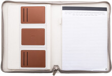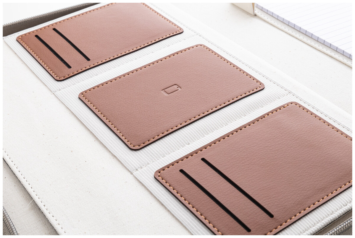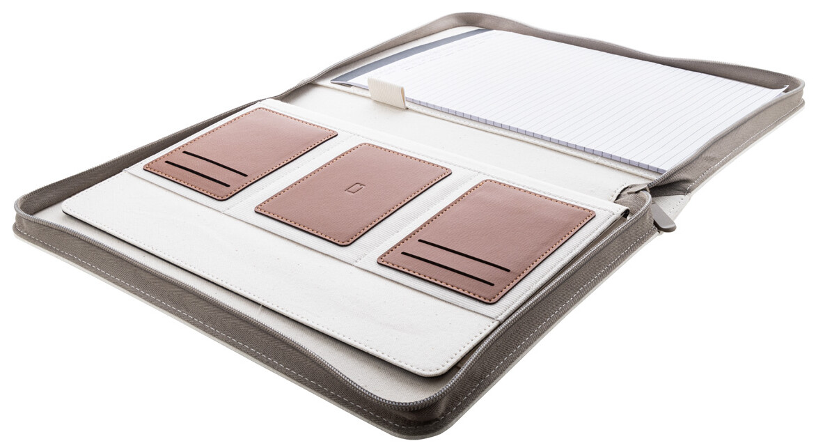Sloha na dokumenty A4 na zip s uchem z recyklovaného plátna a recyklované PU kůže a s několika vnitřními kapsami s organizérem. S 20 linkovanými listy poznámkového bloku z recyklovaného papíru. 70% recyklovaná bavlna a 30% RPET polyester.