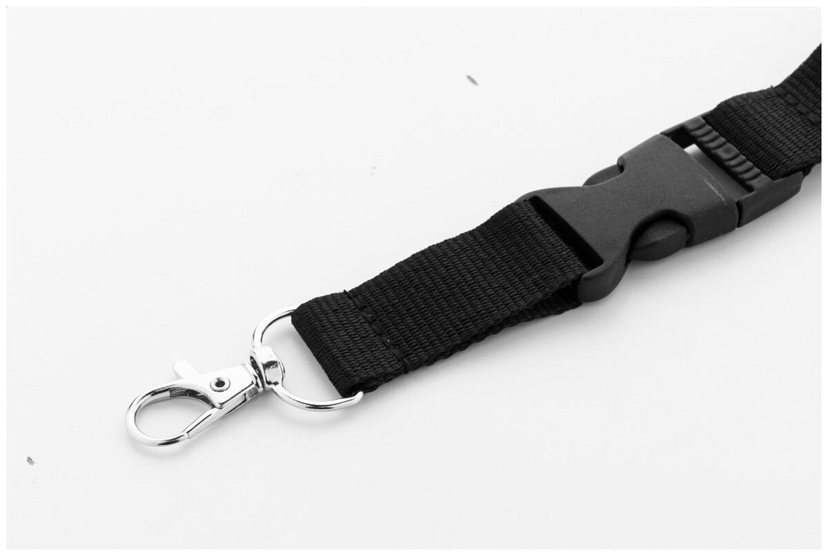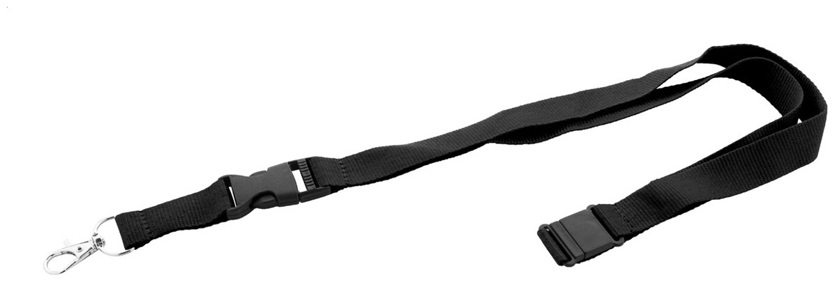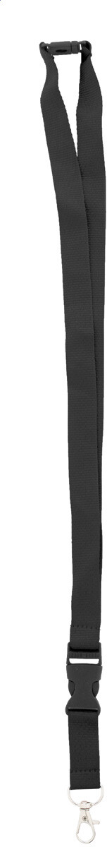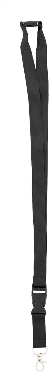 Polyesterový lanyard RPET s odnímatelnou kovovou karabinou a bezpečnostní přezkou.