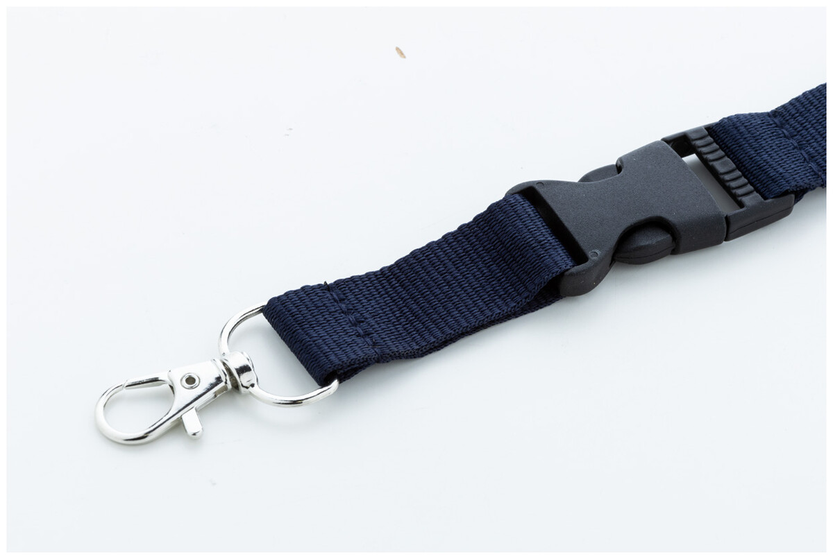 Polyesterový lanyard RPET s odnímatelnou kovovou karabinou a bezpečnostní přezkou.