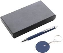 2dílná dárková sada v černé papírové dárkové krabičce. Včetně kuličkového pera z recyklovaného hliníku s pogumovaným povrchem a modrou náplní a přívěsku na klíče z recyklované nerezové oceli s pogumovaným povrchem. Obě položky mají speciální povrchovou úpravu pro zrcadlové laserové gravírování.