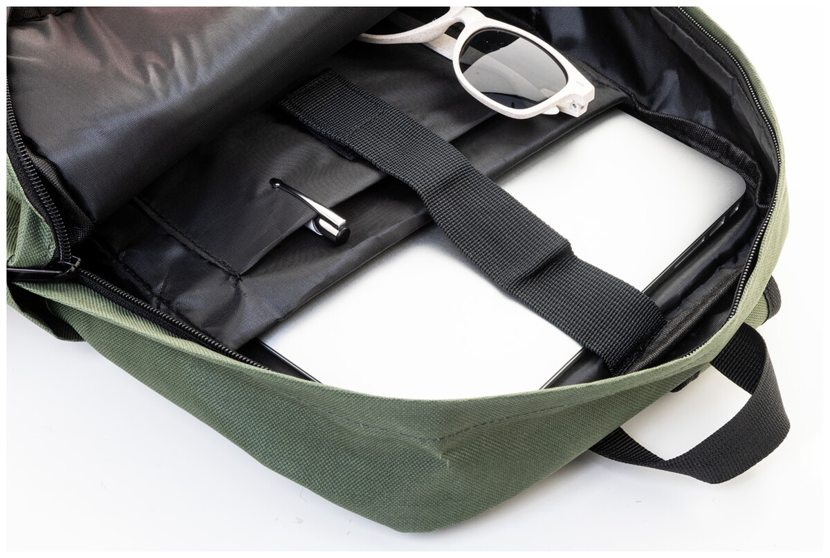 Batoh RPET s hlavním oddílem na zip, 2 předními kapsami na zip, bočními kapsami a polstrovanou přihrádkou na notebook (15") a tablet (10") S polstrovanými zády a ramenními popruhy. Polyester 600D RPET, s výrazným štítkem RPET.