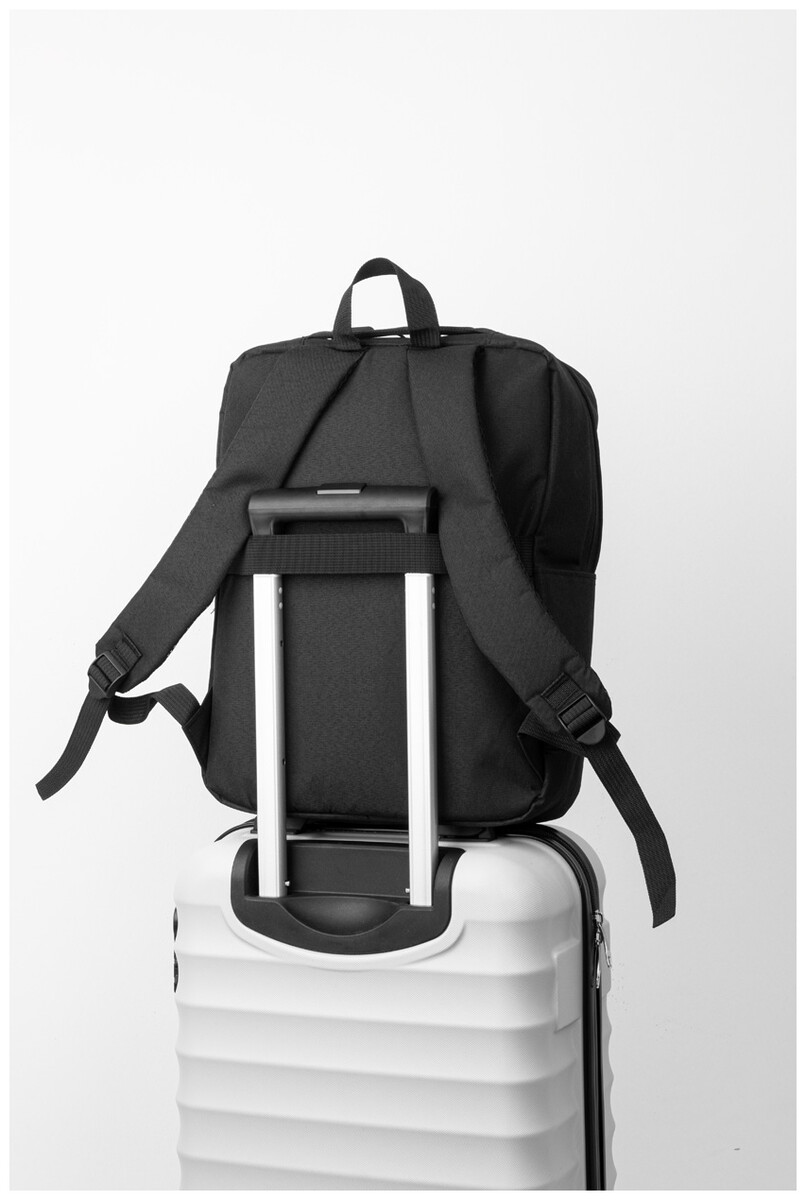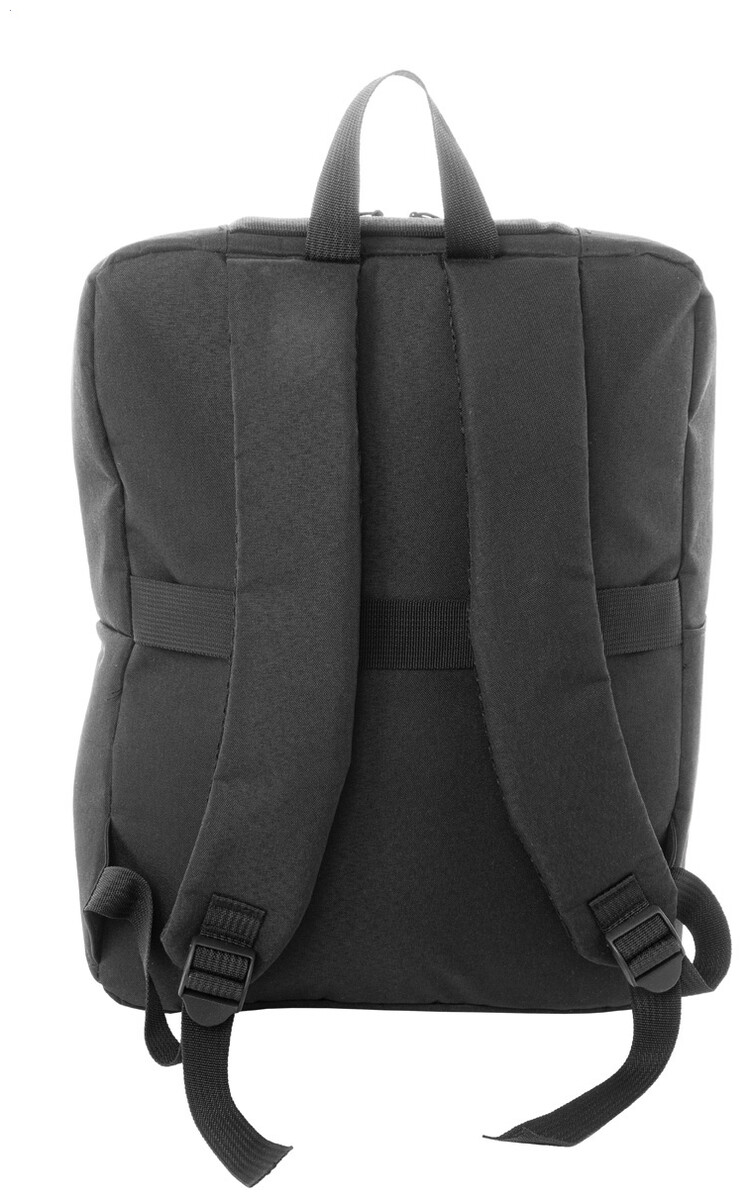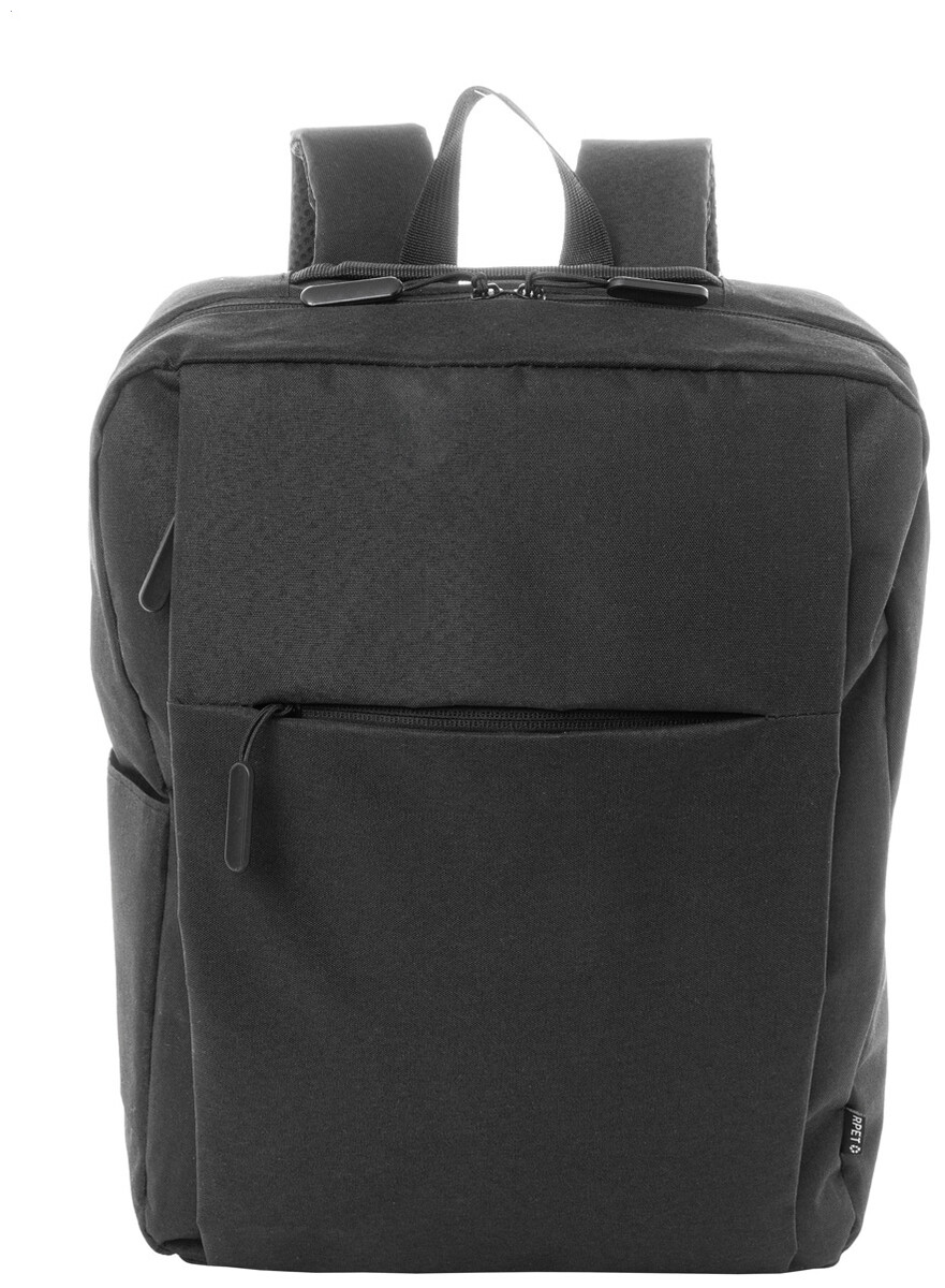 Batoh RPET s hlavním oddílem na zip, 2 kapsami na zip, boční kapsou a polstrovanou přihrádkou na notebook (15"). S popruhem na vozík, polstrovanými zády a ramenními popruhy. Polyester 600D RPET, s výrazným štítkem RPET.