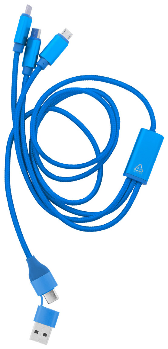 USB nabíjecí kabel z recyklovaného hliníku a RPET s konektory micro USB, USB-C a Lightning. Se vstupy USB a USB-C. Délka kabelu: 100 cm.
