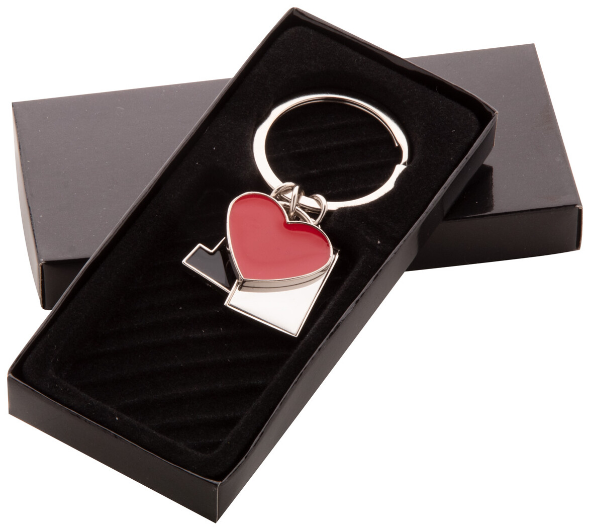 Kovový přívěšek na klíče se 3 přívěšky: "Já", srdce a obdélník. V černé dárkové krabičce.