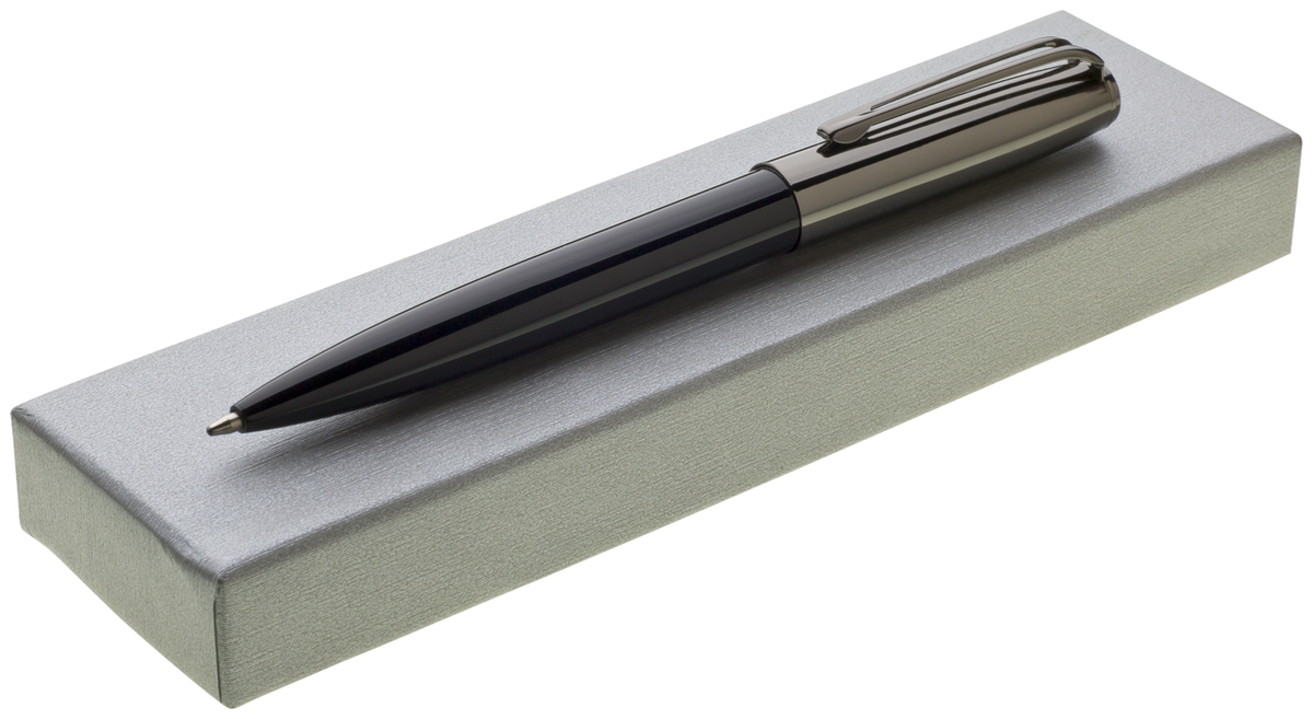 QINATO PLUS kovová otočná propiska v stříbrné papírové krabičce, černá. Náplň velkoobsahová kov modře píšící.