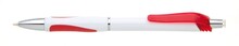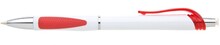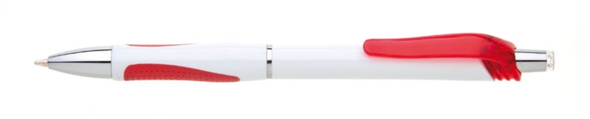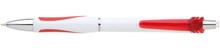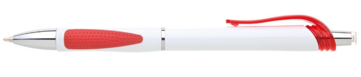 Bílá, plastová propiska s pochromovanými doplňky jako jsou klip, tělo cvakátka a proužek uprostřed těla tužky. Grip je červený, částečně pogumovaný, stejně jako klip. Náplň X20, hrot 1mm.