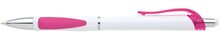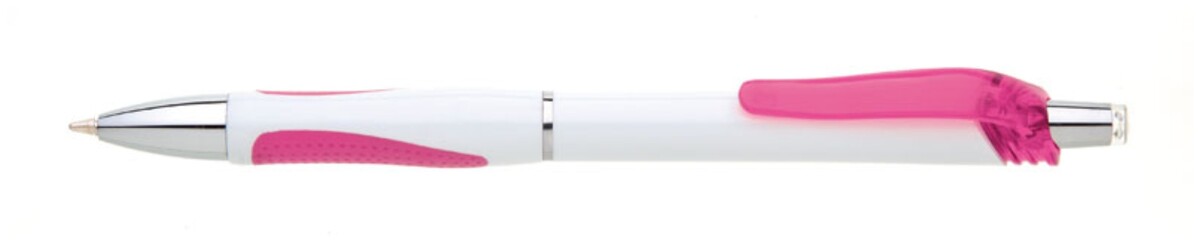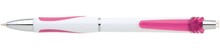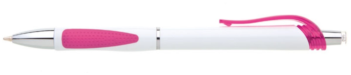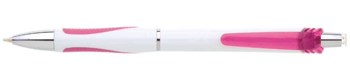 Bílá, plastová propiska s pochromovanými doplňky jako jsou klip, tělo cvakátka a proužek uprostřed těla tužky. Grip je růžový, částečně pogumovaný, stejně jako klip. Náplň X20, hrot 1mm.