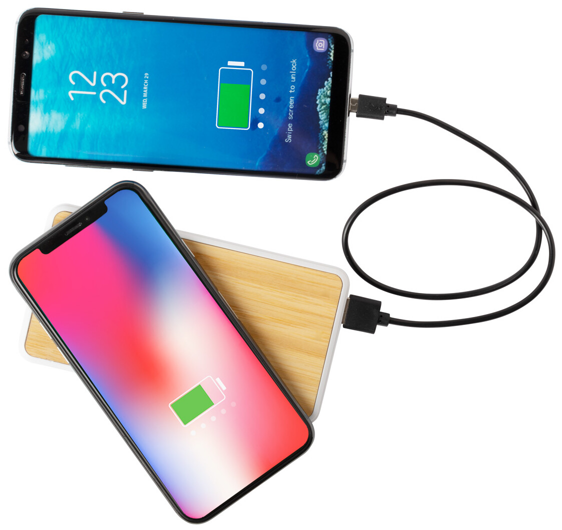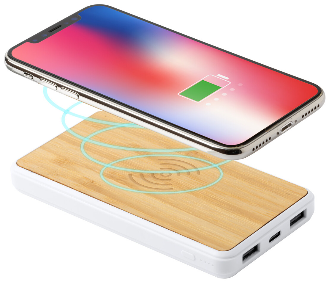 USB power banka s bambusem s 8000 mAh baterií a vestavěnou bezdrátovou nabíječkou. Se 2 USB a 1 USB-C nabíjecími porty, přes které může být power banka nabíjena. Vč. micro USB nabíjecího kabelu.