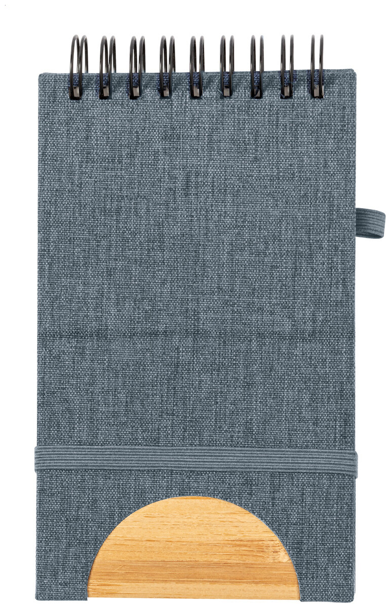 Spirálový blok potažený polyesterem RPET s bambusovou vložkou a funkcí držáku mobilního telefonu. S 80 prázdnými stránkami, gumičkou a držákem na pero.