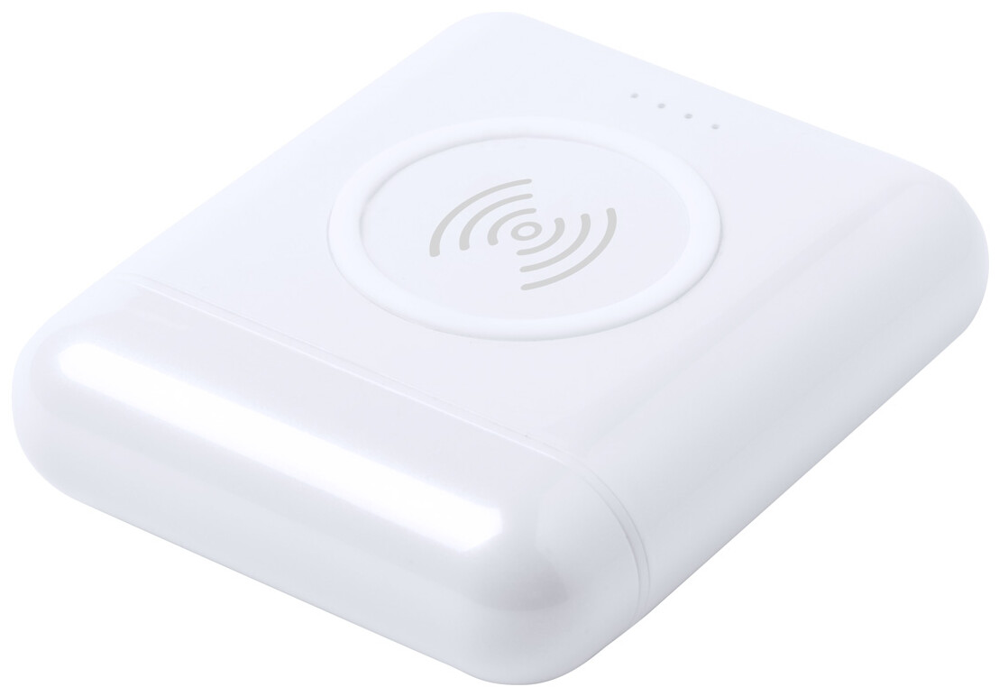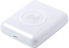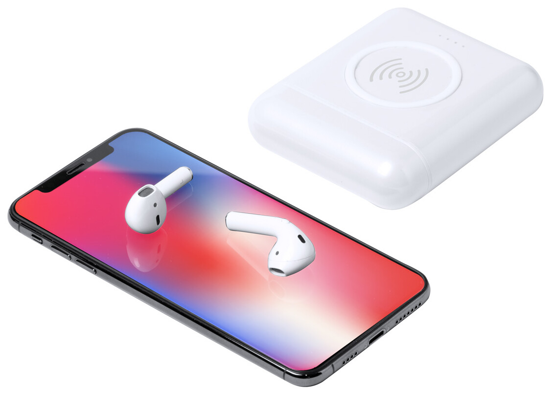 Plastová USB powerbanka s baterií 5000 mAh, vestavěnou bezdrátovou nabíječkou (5 W) a skutečnými bezdrátovými stereofonními sluchátky (TWS) s funkcí hands-free volání. Vstupní port USB-C. Včetně nabíjecího kabelu USB.