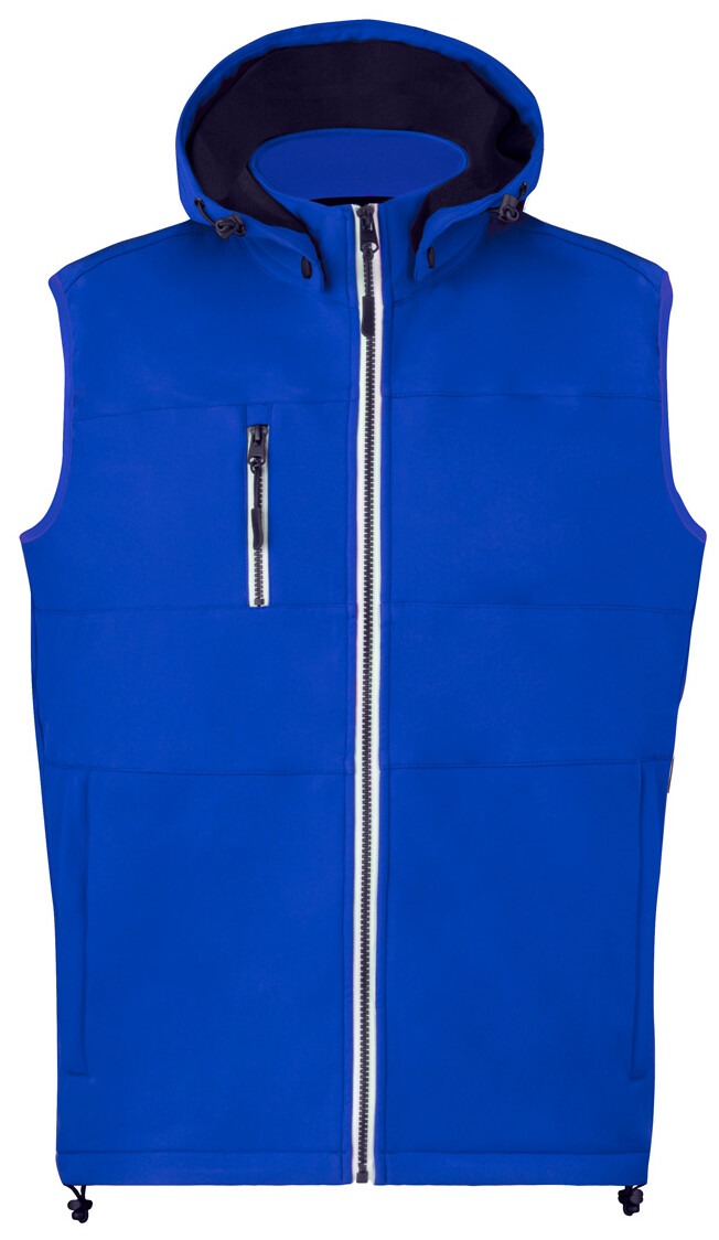 Větru a voděodolná softshellová vesta na zip se 2 bočními kapsami, 1 přední kapsou, stojáčkem a odepínací kapucí. 100% polyester, 300 g/m2.