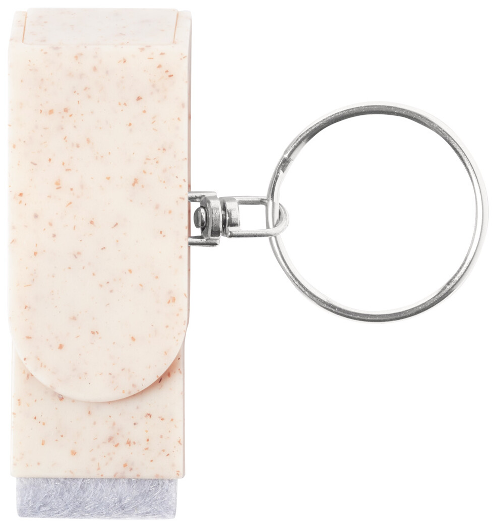 Ekologický plastový držák na mobil z pšeničné slámy s čističem obrazovek a kovovým kroužkem na klíče.