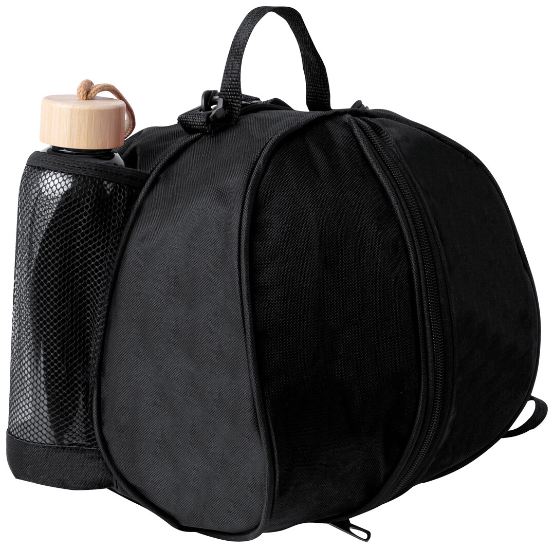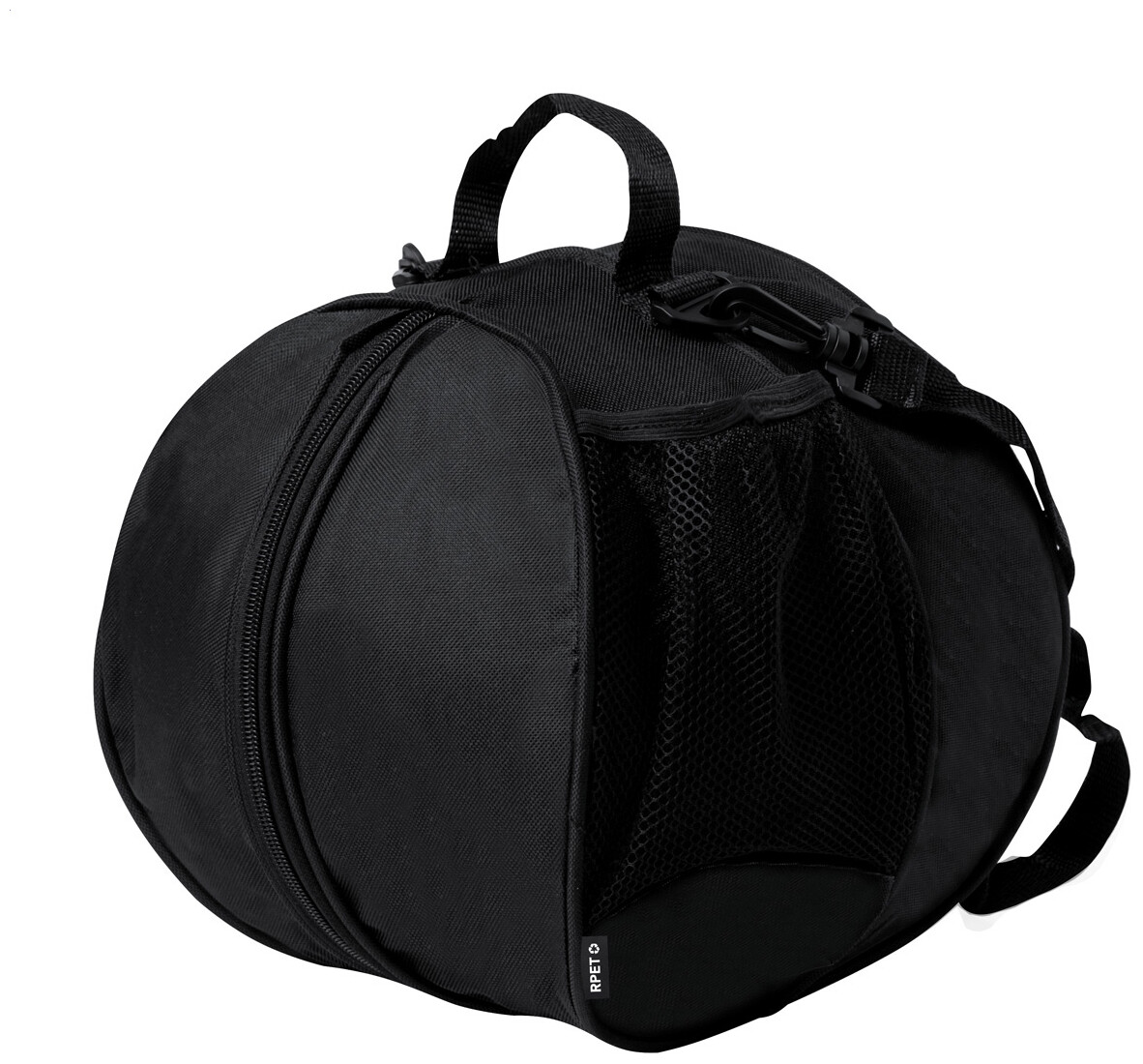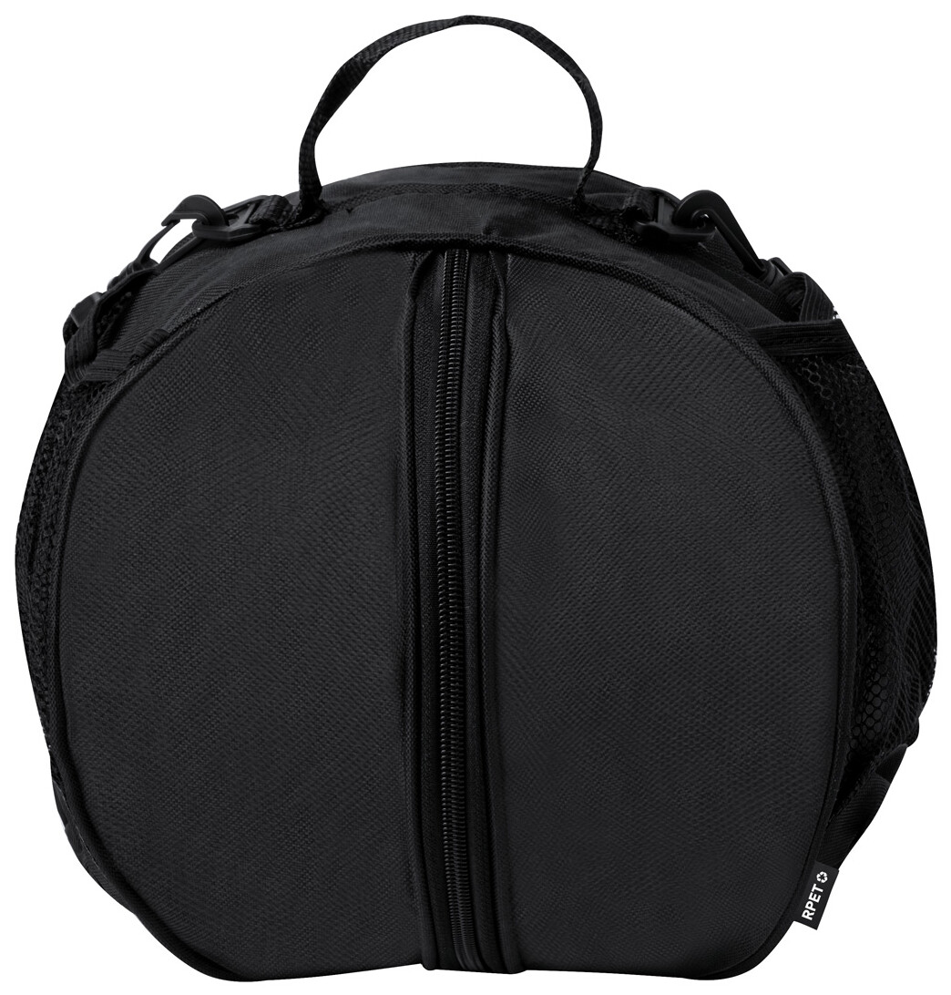 Taška na míče se zipem z 600D RPET polyesteru se síťovanou kapsou na láhev a nastavitelným ramenním popruhem. Dodáváno bez míče.