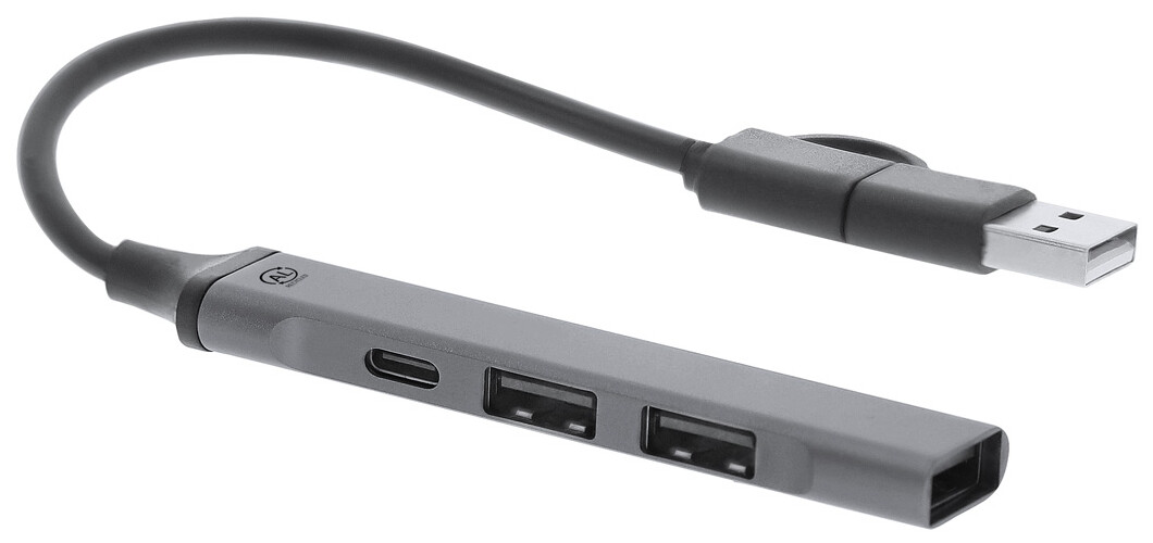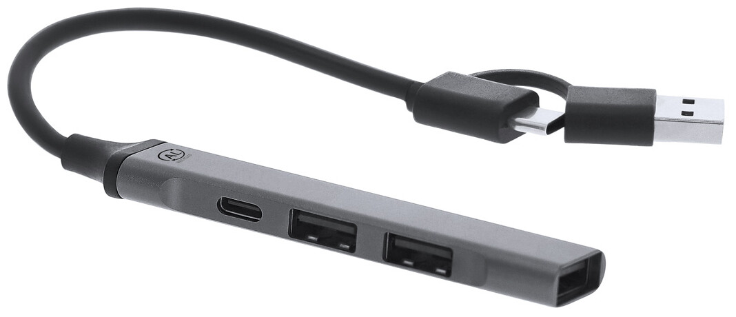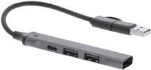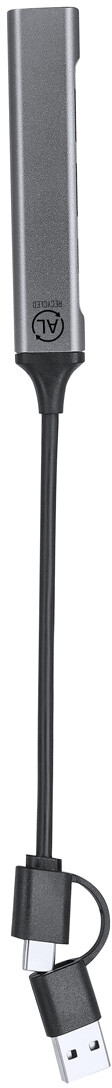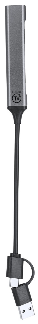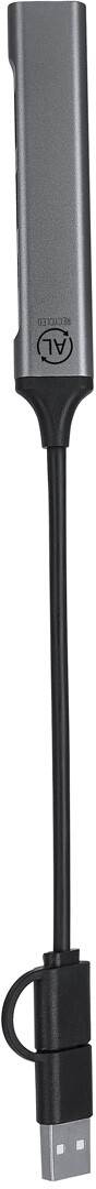 USB hub z recyklovaného hliníku se 3 porty USB (USB 2.0) a 1 portem USB-C (USB 3.0). Včetně kabelu s připojením USB a USB-C.