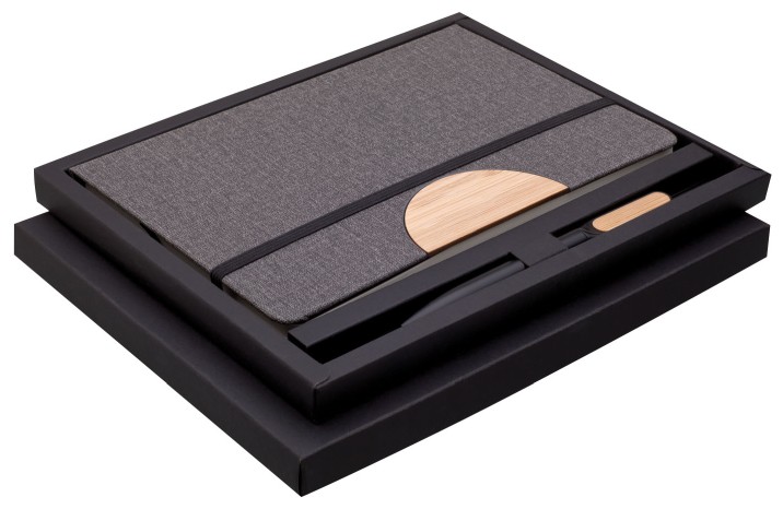 Poznámkový blok, zápisník v textilních deskách, které lze použít jako stojánek na mobil. V černé dárkové krabičce s otočnou propiskou s bambusovou vsadkou.