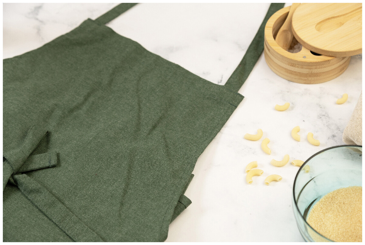 Kuchyňská zástěra ze 70% recyklované bavlny a 30% RPET polyesteru, 180 g/m2.