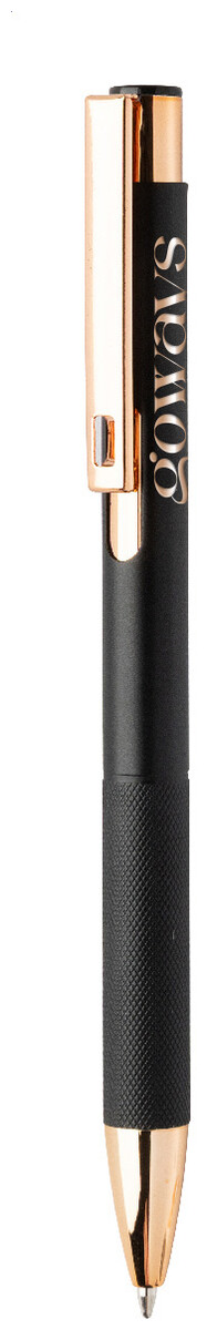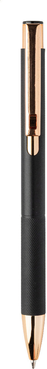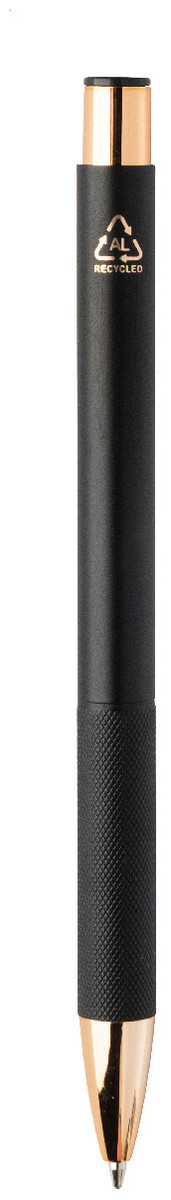 Kuličkové pero z recyklovaného hliníku s matným tělem, texturovaným úchopem a detaily růžového zlata. Se speciálním povrchem pro zrcadlové laserové gravírování v barvě růžového zlata. S modrou náplní.