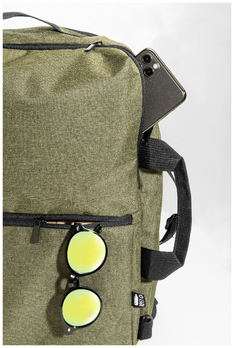 Dvojfunkční RPET batoh a taška na dokumenty s přihrádkou na zip, 2 předními kapsami na zip a polstrovanou přihrádkou na notebook (15"). S polstrovanými zády a ramenními popruhy. Součástí je i odnímatelný ramenní popruh pro použití jako taška na dokumenty. 600D RPET polyester s výrazným štítkem RPET.
