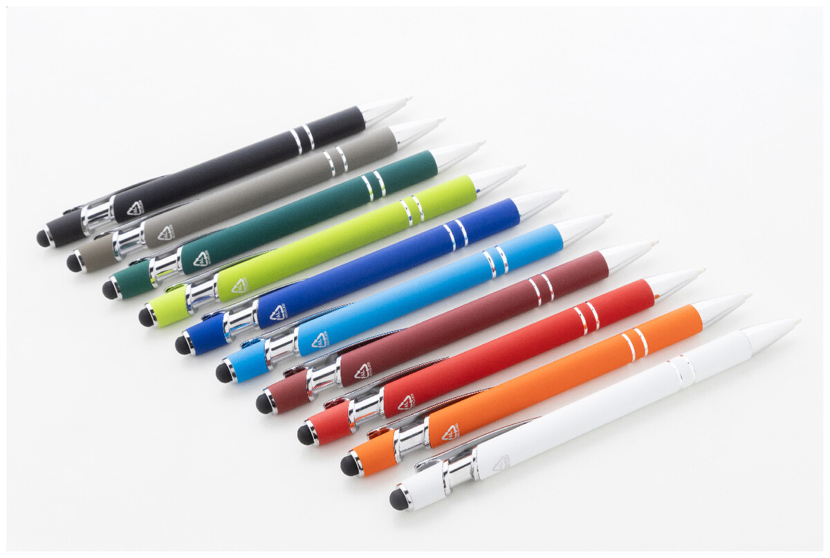 Kuličkové pero a pero pro dotykovou obrazovku z recyklovaného hliníku s pogumovaným tělem a chromovanými detaily. S modrou náplní.