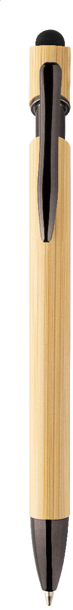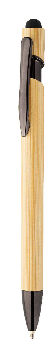 Bambusové dotykové kuličkové pero s lesklými kovovými detaily a barevným dotykovým stylusem. S modrou náplní.