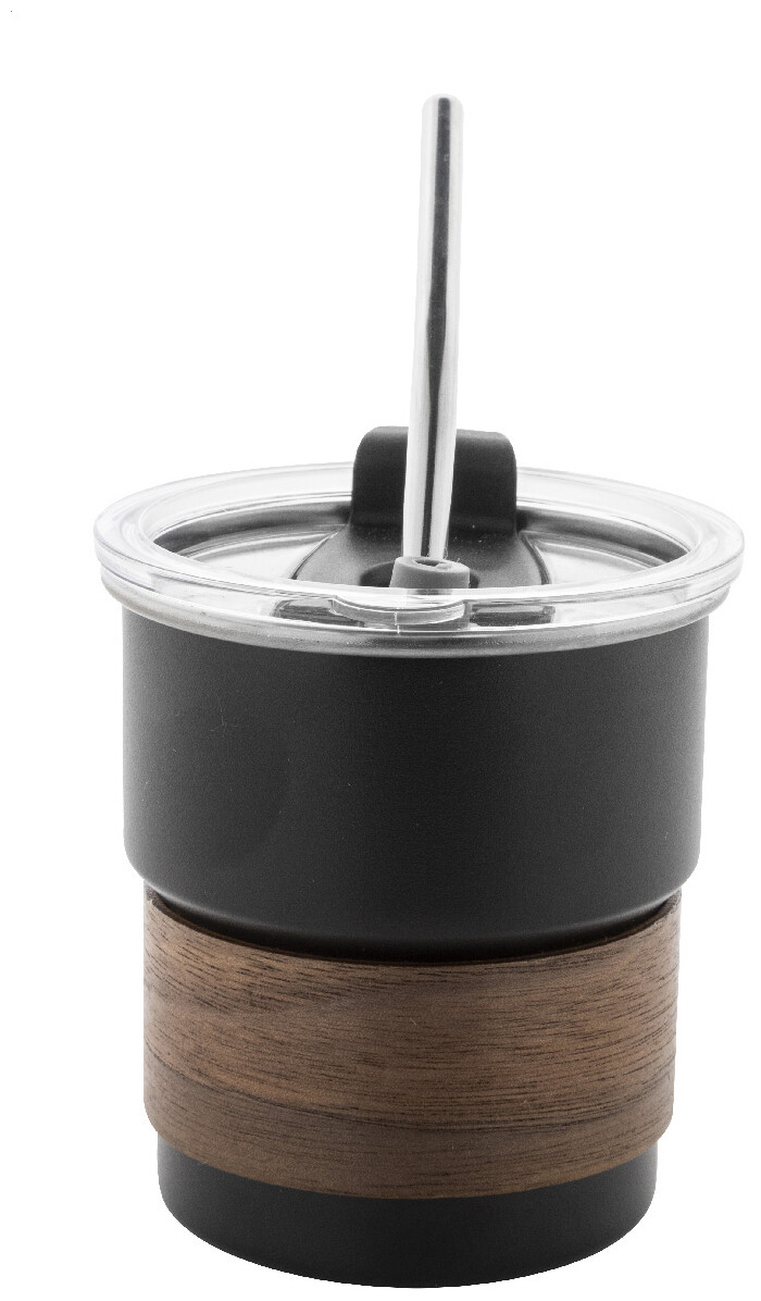 Jednostěnný cestovní hrnek z recyklované nerezové oceli s úchopem z ořechového dřeva, plastovým víčkem a brčkem z recyklované nerezové oceli. 260 ml.