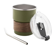 Jednostěnný cestovní hrnek z recyklované nerezové oceli s úchopem z ořechového dřeva, plastovým víčkem a brčkem z recyklované nerezové oceli. 260 ml.