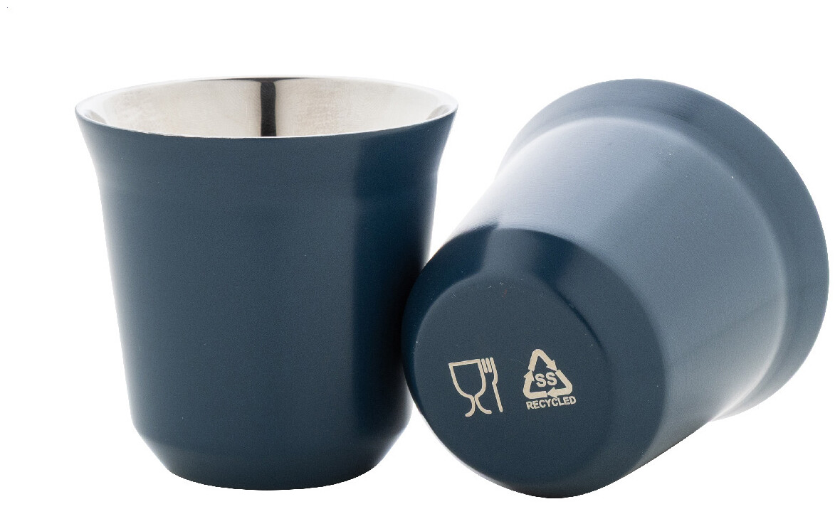 Sada 2 dvoustěnných termohrnků na espresso ve tvaru kávových kapslí z recyklované nerezové oceli, 80 ml. V krabičce z kraftového papíru.