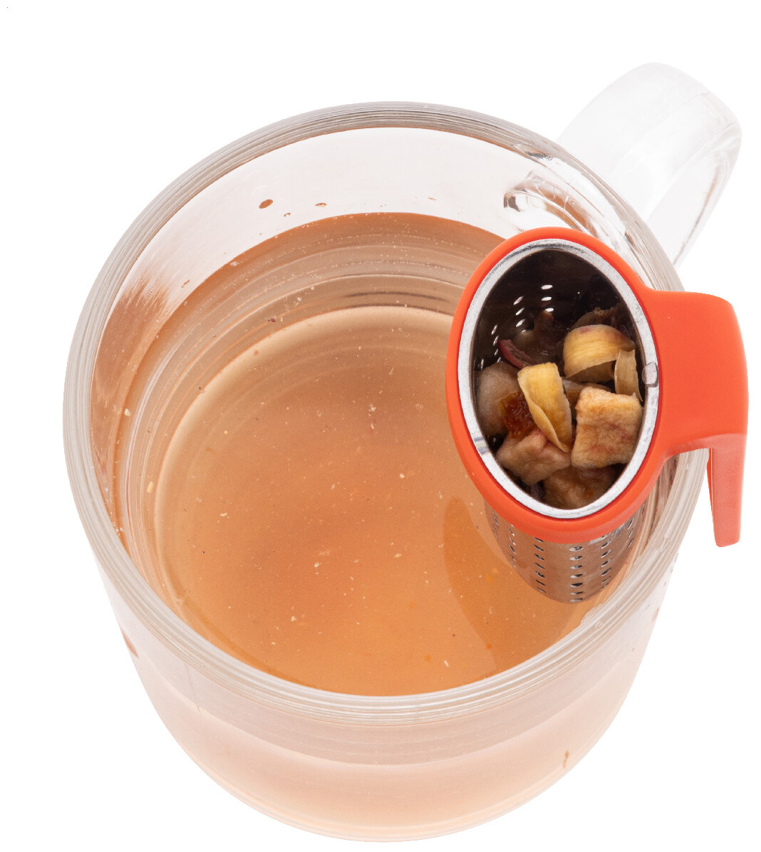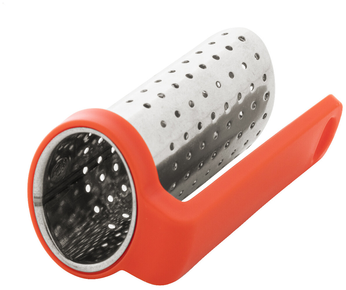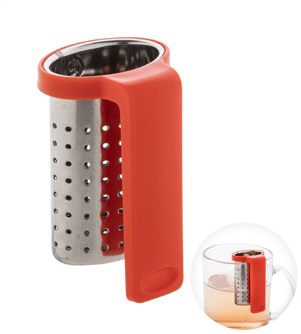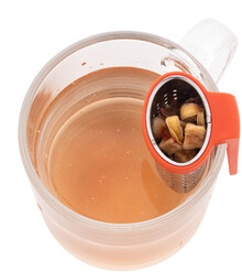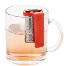 Nerezové sítko na čaj s praktickým klipem z recyklovaného ABS plastu. Navržen pro snadné připevnění k okraji hrnku.