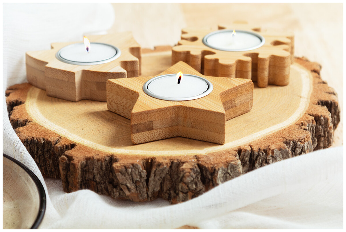 Bambusový vánoční svícen s voskovou čajovou svíčkou na rostlinné bázi s vůní vanilky. Doba hoření: 4 hodiny. V kraftové papírové krabici.