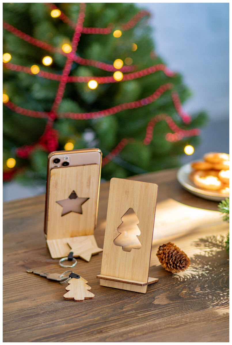 Stojánek na mobil z bambusové překližky s vyřízlým vánočním motivem. Dodáváno rozložené.