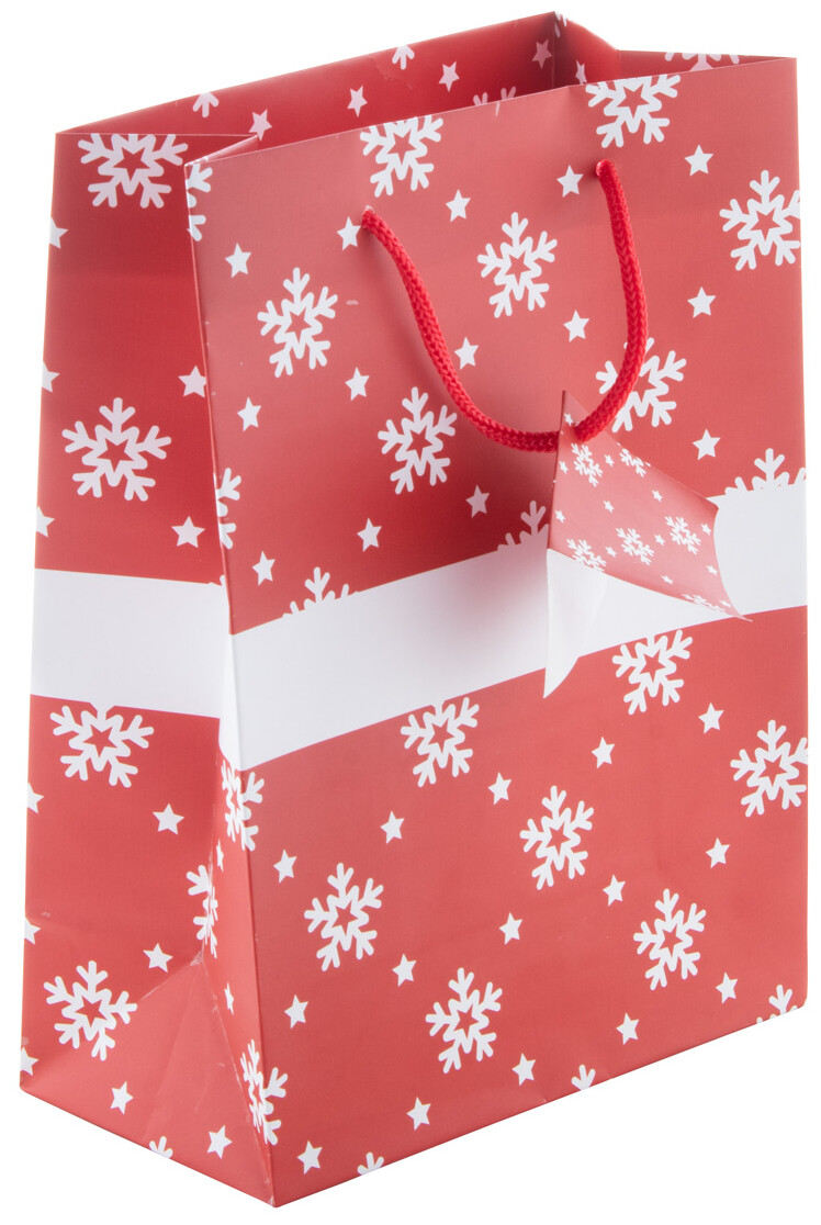 Matná laminovaná papírová dárková taška s vánočním designem, bílou tiskovou plochou a visačkou.