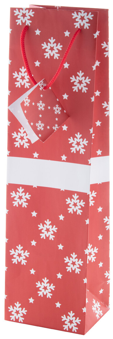 Matná laminovaná papírová dárková taška na láhev vína s vánočním designem, bílou tiskovou plochou a visačkou.