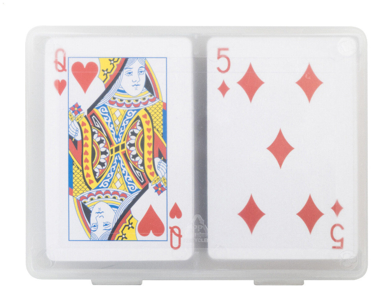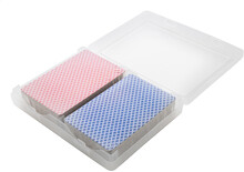 Sada papírových francouzských hracích karet v krabičce z recyklovaného PP. Obsahuje dva standardní balíčky po 54 kartách s červenou a modrou zadní stranou.