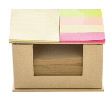 Dávkovač poznámkových bloků ve tvaru domečku z recyklovaného kartonu s blokem na 300 listů z recyklovaného kraftového papíru. Včetně 25 žlutých samolepicích papírků a 100 značkovačů stránek (ve 4 barvách) nahoře.