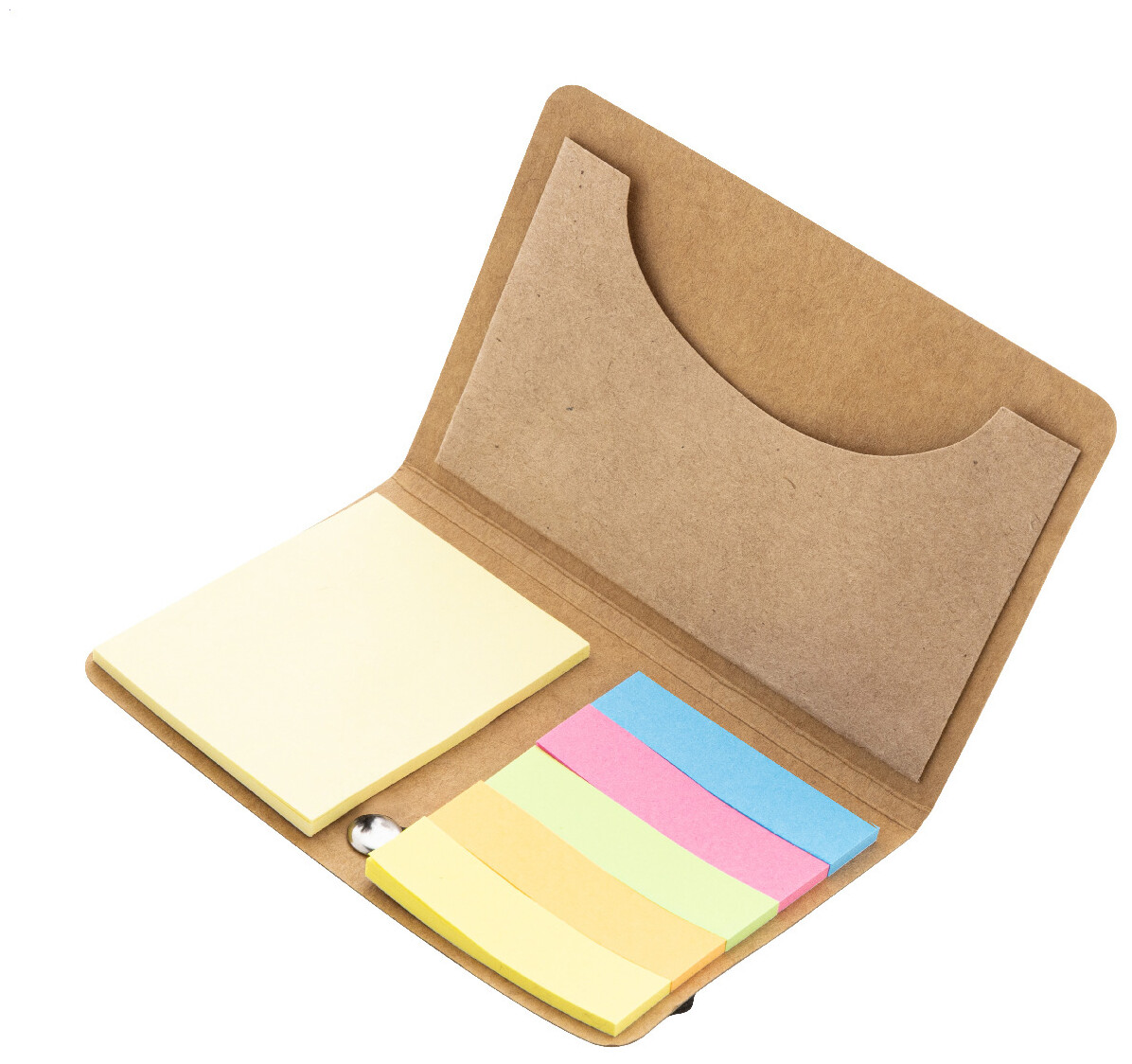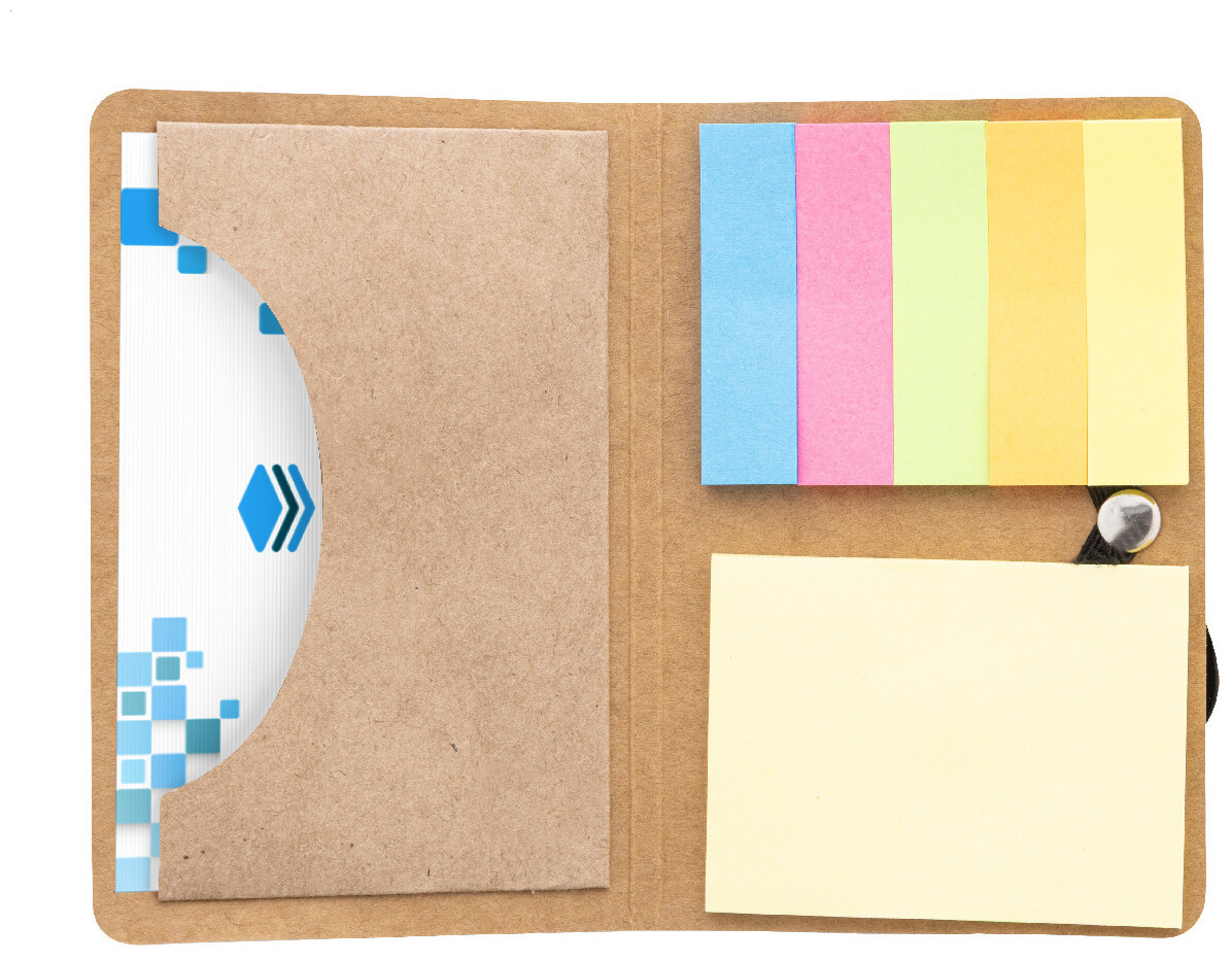 Pouzdro na karty z kraftového papíru s samolepicími papírky z recyklovaného papíru a elastickým zavíracím popruhem. Včetně 25 žlutých samolepicích papírků a 125 značkovačů stránek (v 5 barvách).