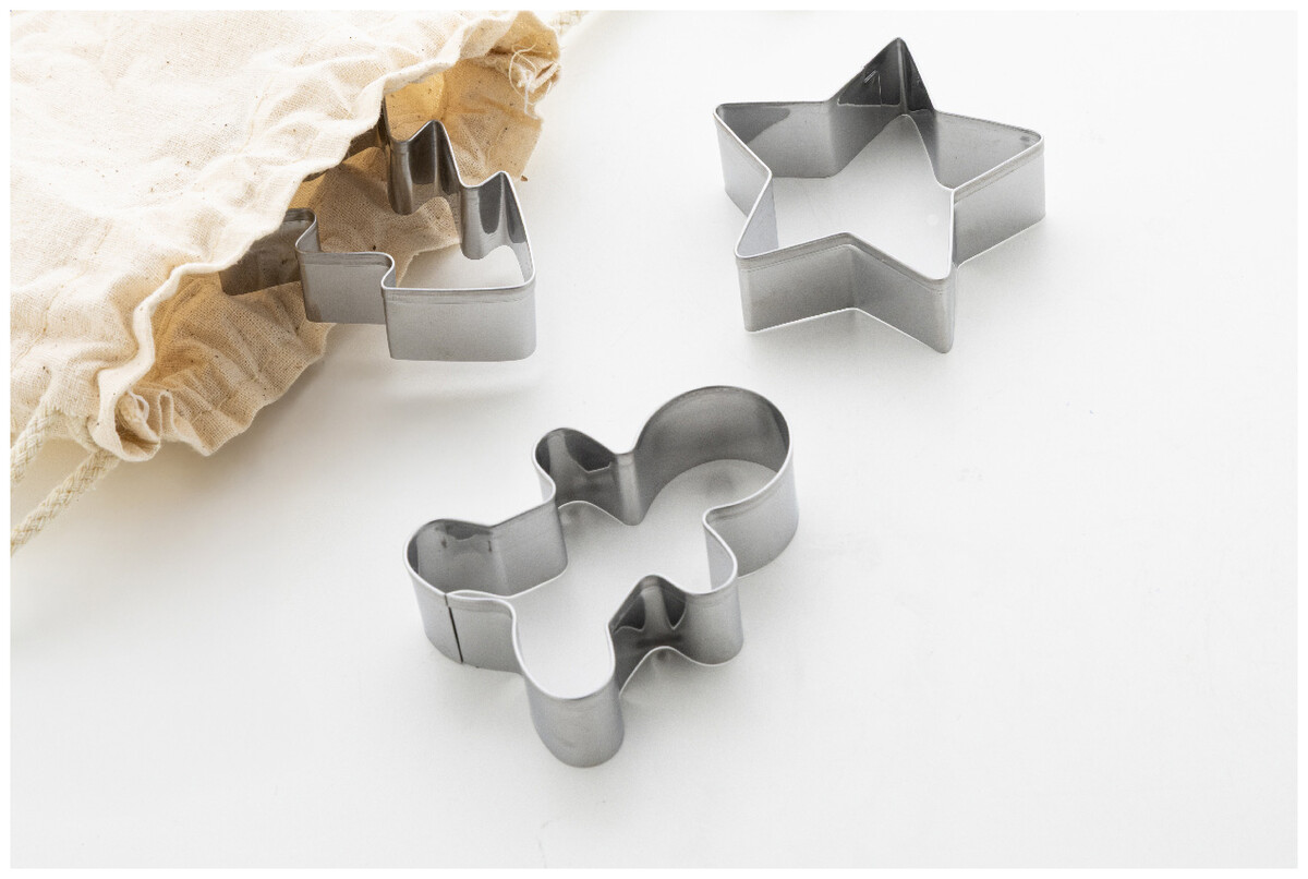 Sada 3 vykrajovátek na sušenky z nerezové oceli s vánočními tvary, v bavlněném pytlíku se stahovací šňůrkou.
