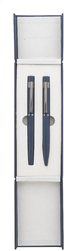 Elegantní sada kovového kuličkového pera a rolleru s lesklými detaily v barvě antracit. V barevně sladěné dárkové krabičce a s modrou náplní. Produkt značky André Philippe.