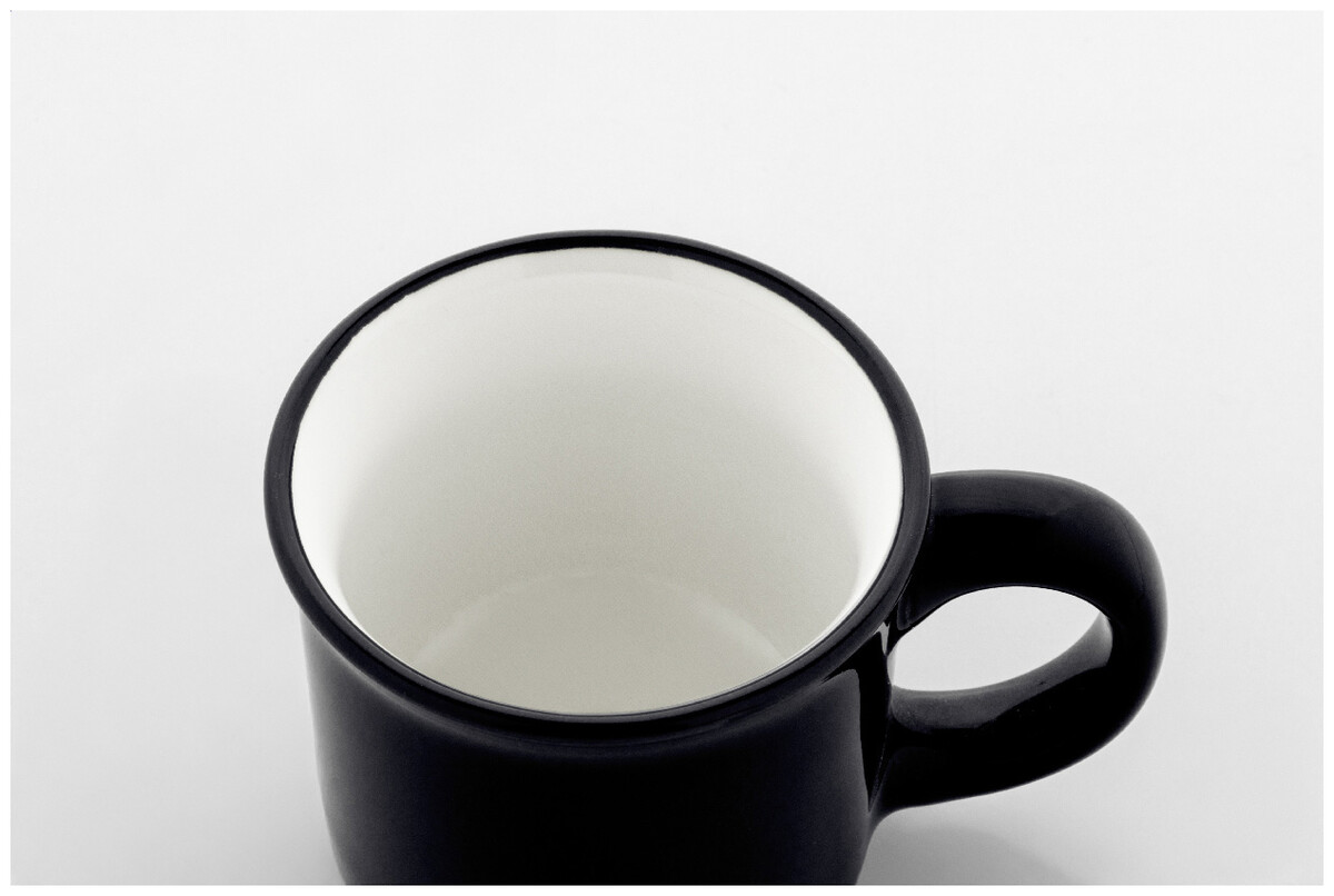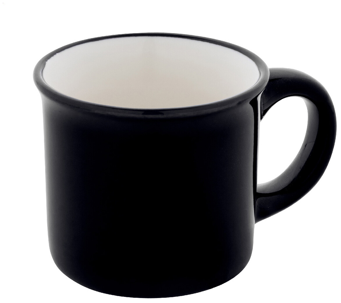 Mini vintage keramický hrnek s černým okrajem, bílým uvnitř a barevným vnějškem, 90 ml. V krabičce z kraftového papíru.