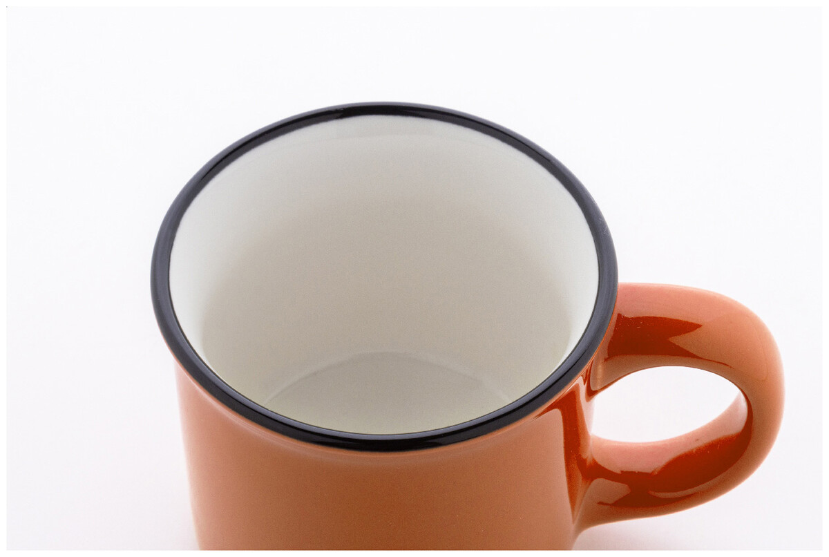 Mini vintage keramický hrnek s černým okrajem, bílým uvnitř a barevným vnějškem, 90 ml. V krabičce z kraftového papíru.