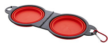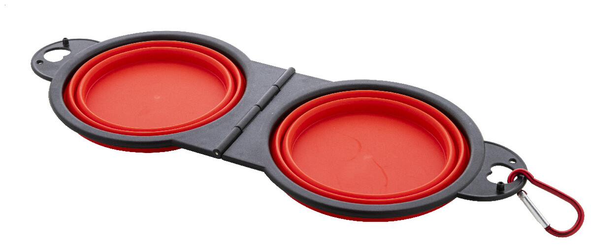 Skládací miska pro domácí mazlíčky z odolného TPE se dvěma přihrádkami o objemu 450 ml a barevně sladěnou hliníkovou karabinou.