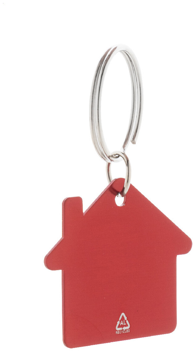 Přívěšek na klíče ve tvaru domečku z recyklovaného hliníku s kovovým kroužkem.